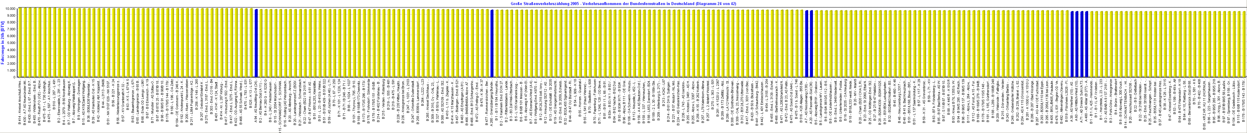 Verkehrsaufkommen der Bundesstraßenabschnitte in Deutschland nach täglichem Verkehrsaufkommen (PDF, Bericht 7, 492 Seiten, 5,04 MB) Gibt Auskunft über die Verkehrsbelastung der Bundesstraßen in Deutschland. In einem ersten Teil wird das normale durchschnittliche, tägliche Verkehrsaufkommen der Bundesstraßen behandelt und in Belastungstypen aufgeteilt dargestellt. Der zweite Teil besteht aus einer langen Tabelle in der alle Strecken nach Rang und Gesamtverkehrsbelastung absteigend aufgeführt sind. Also, Strecken mit der stärksten Belastung zuerst.